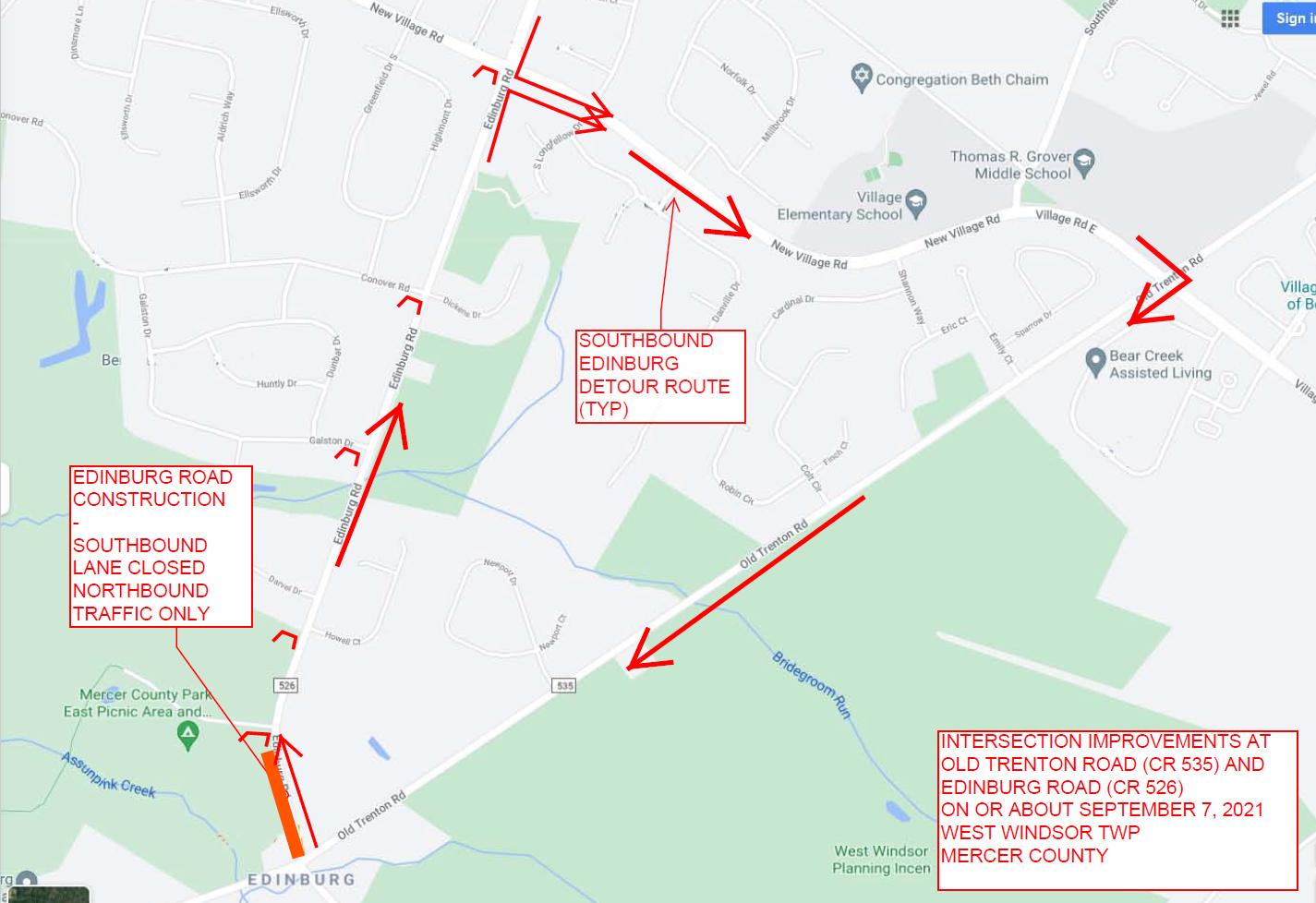 The County of Mercer has postponed the start of the work at the intersection of Old Trenton Road (CR 535) and Edinburg Road (CR 526) due to the need to divert crews to necessary repairs in the wake of post-Ida infrastructure damage assessments. A future start date will be announced when received.