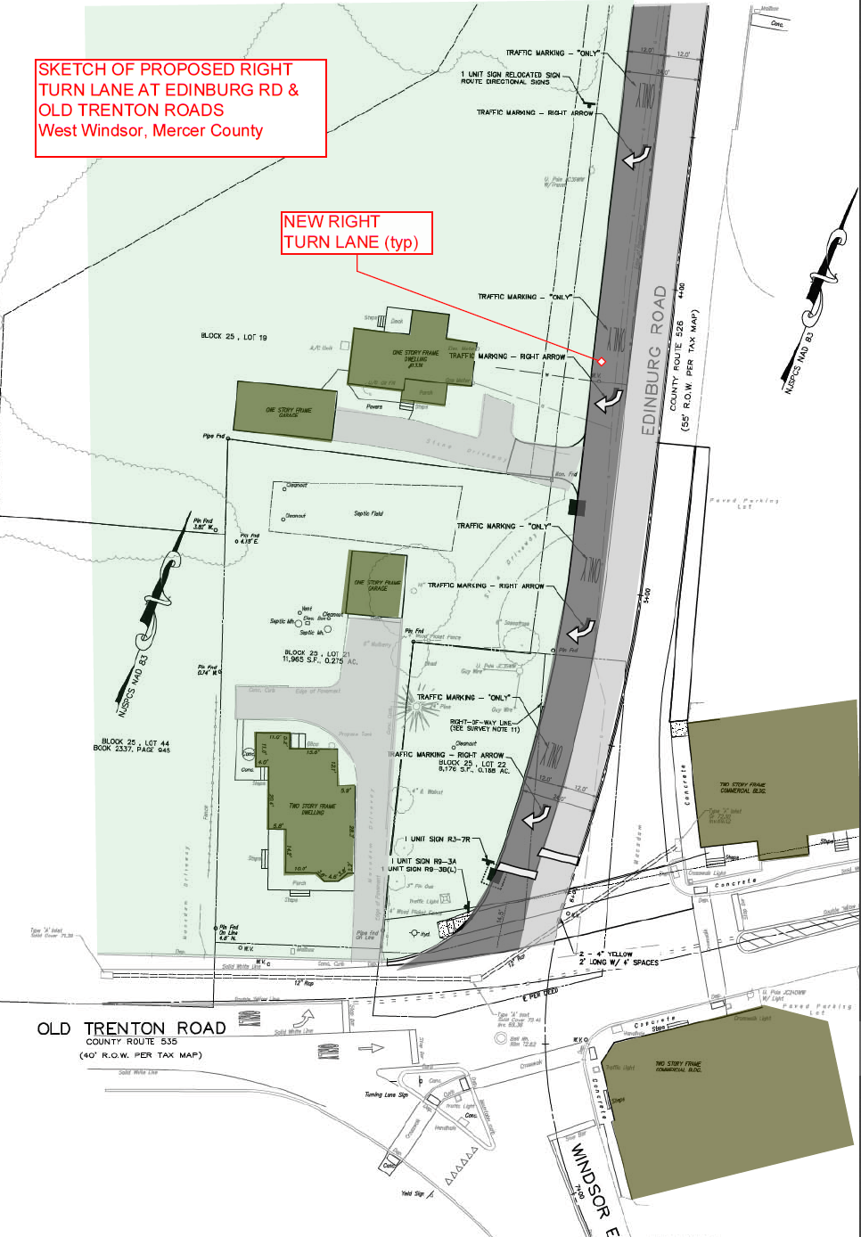 The County of Mercer will begin road work at the intersection of Edinburg Road (CR 526) and Old Trenton Road (CR 535), starting on or about Monday, July 26, 2021. The work will result in the addition of a right-turn lane on south bound Edinburg Road (see sketch). Working hours will be Monday – Friday from 9:00 am – 3:00 pm and the duration of the project is expected to be approximately two (2) weeks, weather permitting. During the project the roadways in the vicinity are expected to remain open to the traveling public. Intermittent lane closures may occur with utility work and the paving work. Please honor all temporary traffic control measures for your safety and the safety of others.