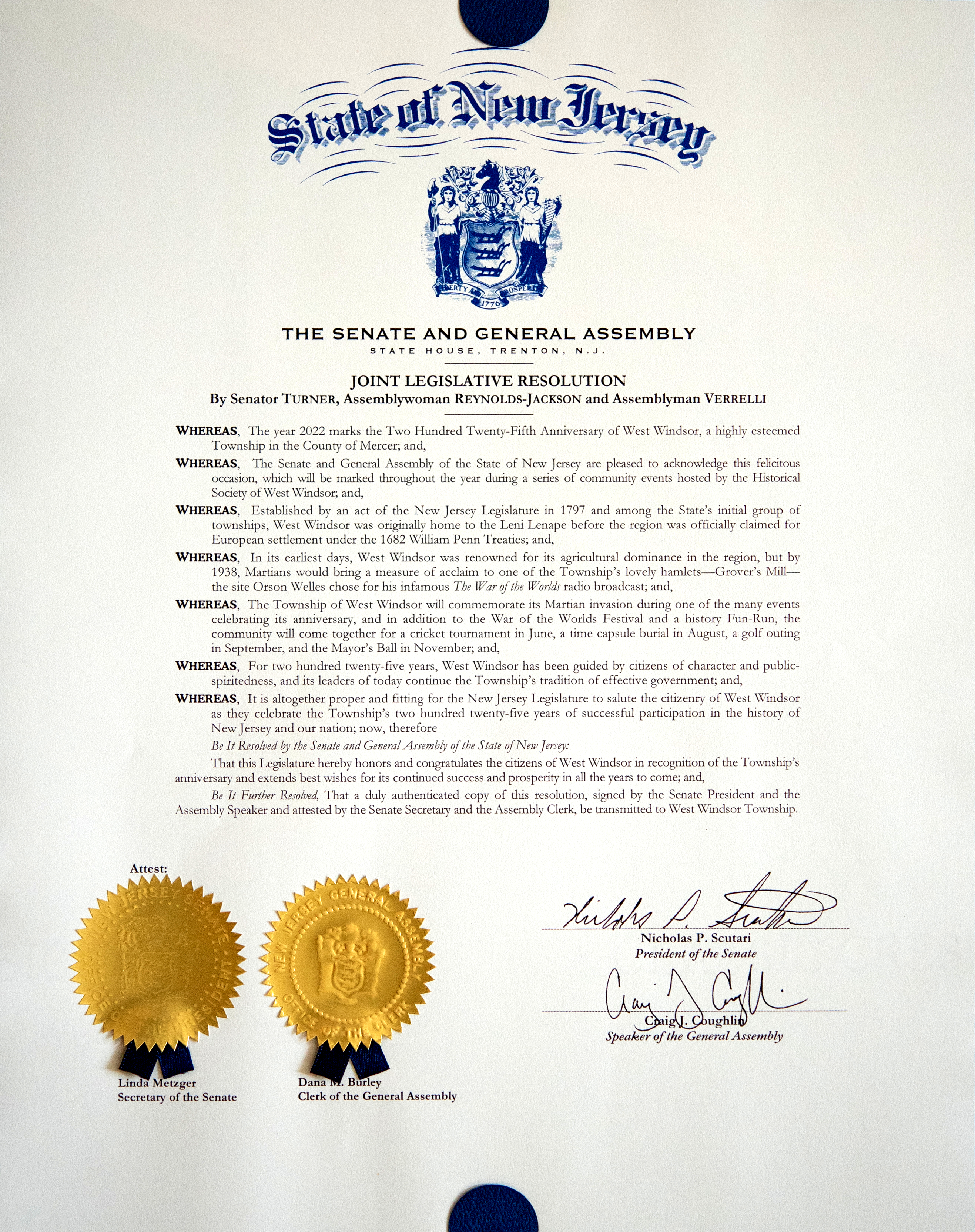 In 1838, Mercer County was established and in 1853, the current borders for West Windsor were defined containing 26.84 miles. Today, West Windsor can still identify the six farming villages that were a part of the area:
